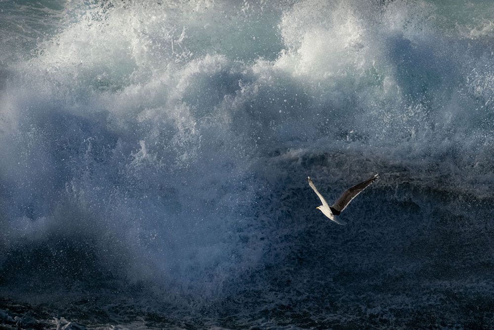 For this series of images, which I began more than ten years ago, two very ephemeral movements must come together: the flight of a bird with an uncertain trajectory and the explosion of a wave. Perseverance is essential for this type of image. Several times I have spent entire days in the storm waiting for a bird to pass by at the right moment and photographed nothing. This can be frustrating, but I think it's necessary for a photographer to push back their limits.